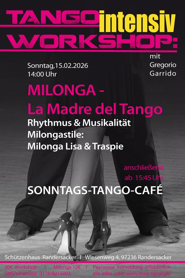 - Milonga lebt im Gegensatz zum Tango oder zum Vals vom Rhythmus, Musikalität ist hier das Ah und Oh.. Milonga lisa y Milonga Traspie und die typischen Schrittrhythmen der unterschiedlichen Milonga-Stile sowie passende Tanz-/ Schrittelemente sind Thema des Intensiv-Workshops, im Anschluss findet das Sonntags-Tango-Café statt
